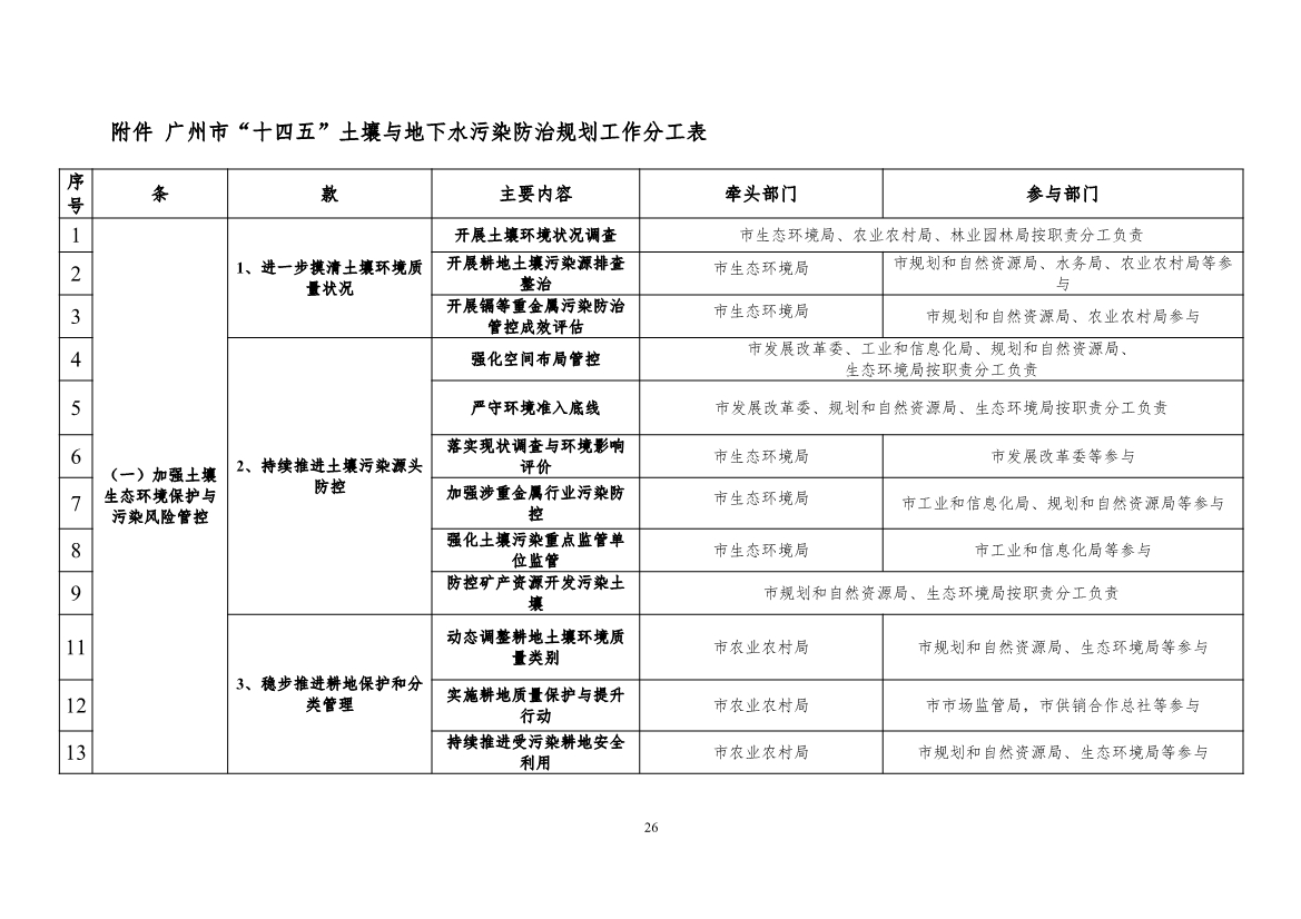 獲悉,8月22日,廣州市生態(tài)環(huán)境局發(fā)布關(guān)于公開征求《廣州市土壤與地下水污染防治“十四五” 規(guī)劃(征求意見稿)》意見的公告,《規(guī)劃》提出,到 2025 年,全市土壤與地下水污染源得到基本控制,環(huán)境質(zhì)量總體保持穩(wěn)定,局部有所改善,農(nóng)用地和重點(diǎn)建設(shè)用地安全利用得到鞏固提升,進(jìn)一步保障老百姓“吃得放心、住得安心”,土壤與地下水環(huán)境風(fēng)險(xiǎn)得到進(jìn)一步管控。