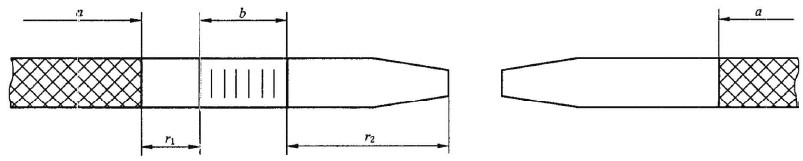 式中,Ag是最大力Fm塑性延伸率。Ag應(yīng)以一個100mm的標(biāo)距長度進(jìn)行測定,距斷口的距離r2至少為50mm或2d(選擇較大者),如果夾持和標(biāo)距長度之間的距離r1小于20mm或d(選擇較大者)時,該試驗可視作無效,見圖1。