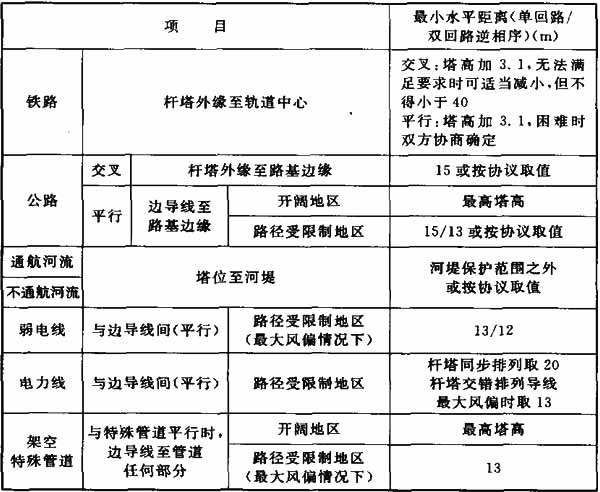 2 1000kV架空輸電線(xiàn)路與鐵路、道路、河流、管道、索道及各種架空線(xiàn)路水平接近距離,應(yīng)符合表13.0.9-2的規(guī)定。