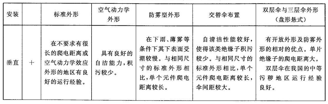 下面用表1簡(jiǎn)要說(shuō)明了主要的外形型式相對(duì)于污穢性能的主要優(yōu)點(diǎn)和缺點(diǎn)。