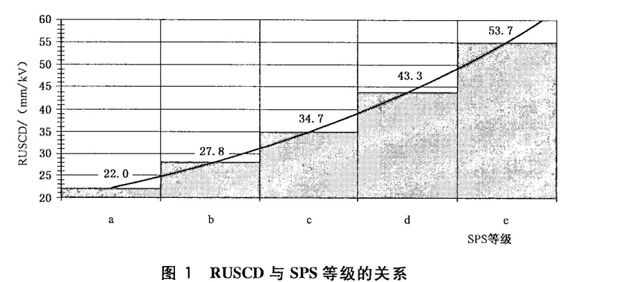 圖1示出了玻璃和瓷絕緣子的SPS等級(jí)和RUSCD間的關(guān)系。直方形代表了每一等級(jí)最低要求的優(yōu)先選用值并供GB/T 26218.1中所陳述的方法3使用。如果SPS等級(jí)估計(jì)趨向鄰近的較高的等級(jí),那么可能要沿著曲線選用。