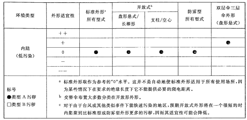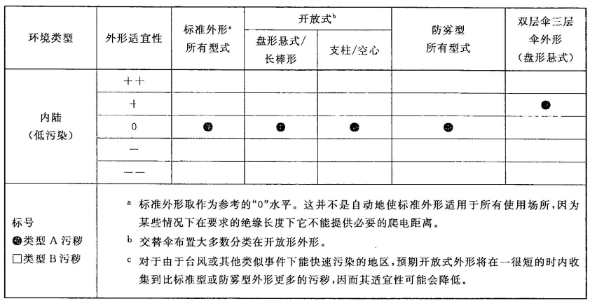 污穢常常不是用來(lái)選擇絕緣子外形的唯一參數(shù)。絕緣子材料、設(shè)計(jì)、制造工藝或應(yīng)用可能會(huì)排除某些外形。因此,對(duì)絕緣子――污穢類型組合的最佳外形可能不會(huì)使用。因此不能排除某一不太適宜的外形的選擇或使用。
