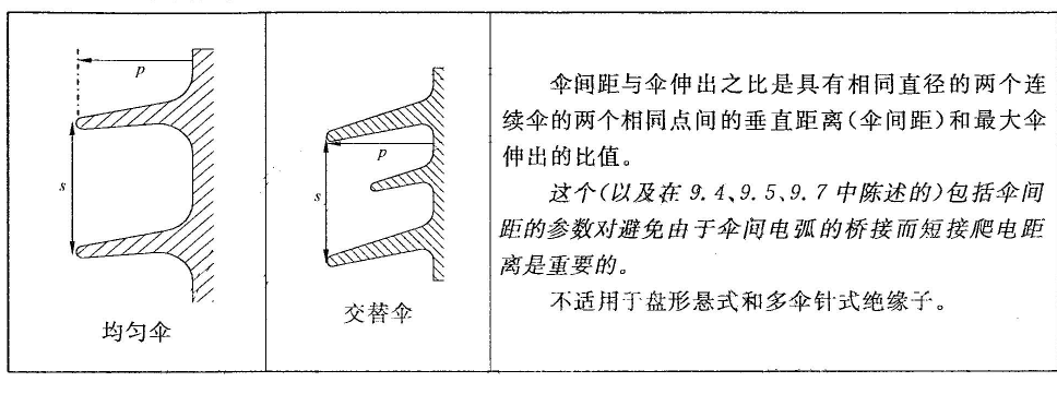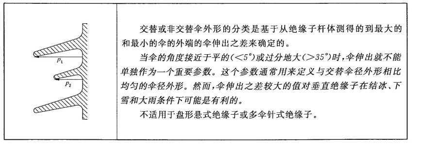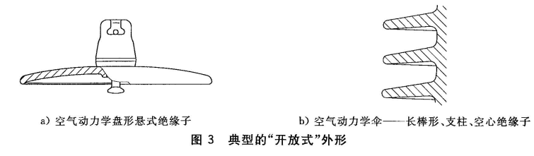 注:在長(zhǎng)棒形、支柱和空心絕緣子情況下,典型的標(biāo)準(zhǔn)外形的傘傾角是,傘的上表面的傘傾角a為14°~24°,傘的下表面的傘傾角β是8°~16°(示于圖2b))。通常,較小的角度考慮作為空氣動(dòng)力學(xué)形,較大的角度考慮作為防霧型。