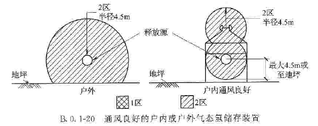 18 氣態(tài)氫氣儲(chǔ)存裝置位于通風(fēng)良好的戶內(nèi)或戶外(圖B.0.1-20)的危險(xiǎn)區(qū)域劃分宜符合下列規(guī)定: