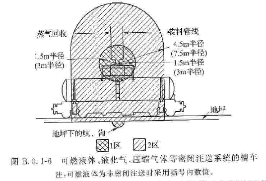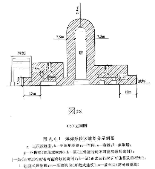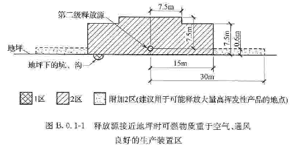 1)釋放源高于地面7.5m以上時(shí)以釋放源為中心,半徑為1m的范闈內(nèi)可劃為1區(qū),以釋放源為中心,半徑為7.5m的范同內(nèi)可劃為2區(qū);