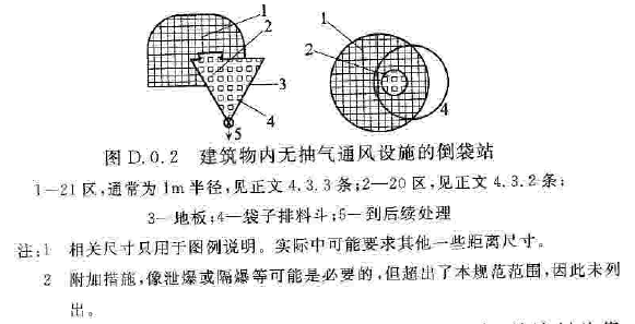 注:如果粉塵層堆積,則考慮了粉塵層的范圍以及擾動(dòng)該粉塵層產(chǎn)生粉塵云的情況和現(xiàn)場(chǎng)的清理水平(見(jiàn)附錄D)后.可以要求更進(jìn)一步的細(xì)分類。如果在粉塵袋子放空期間因空氣的流動(dòng)可能偶爾攜帶粉塵云超出了21區(qū)范圍,則劃為22區(qū)。