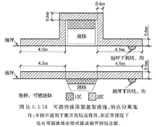 16 可燃性液體緊急集液池、油水分離池(圖B.0.1-18)的危險(xiǎn)區(qū)域的范圍劃分宜符合下列規(guī)定: