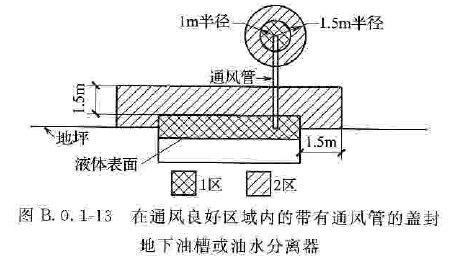 11 對(duì)于在通風(fēng)良好區(qū)域內(nèi)的帶有通風(fēng)管的蓋封地下油槽或油水分離器(圖B.0.1-3),當(dāng)液體表面為連續(xù)釋放源時(shí),爆炸危險(xiǎn)區(qū)域范圍劃分宜符合下列規(guī)定: