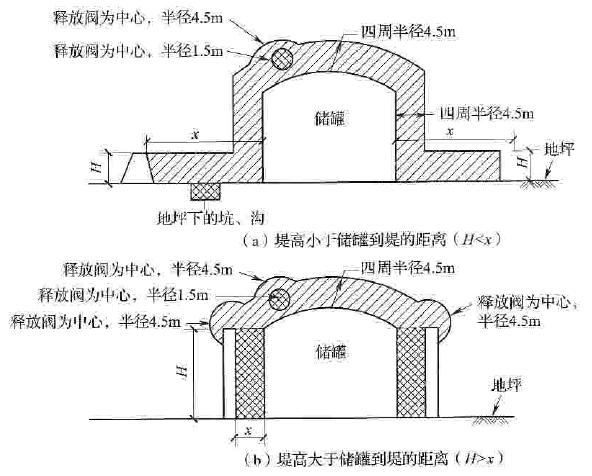 3 對(duì)于可燃物質(zhì)重于空氣的貯罐(圖B.0.1-4和圖B.0.1-5),爆炸危險(xiǎn)區(qū)域的范圍劃分宜符合下列規(guī)定: