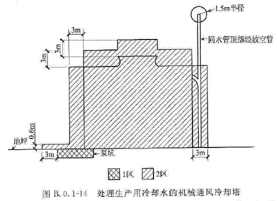 12 對(duì)于處理生產(chǎn)裝置用冷卻水的機(jī)械通風(fēng)冷卻塔(圖B.0.1-4),當(dāng)劃分為爆炸危險(xiǎn)區(qū)域時(shí),以回水管頂部烴放空管管口為中心,半徑為1.5m和冷卻塔及其上方高度為3m的范圍可劃分為2區(qū),地坪下的泵坑的范圍宜為1區(qū)。