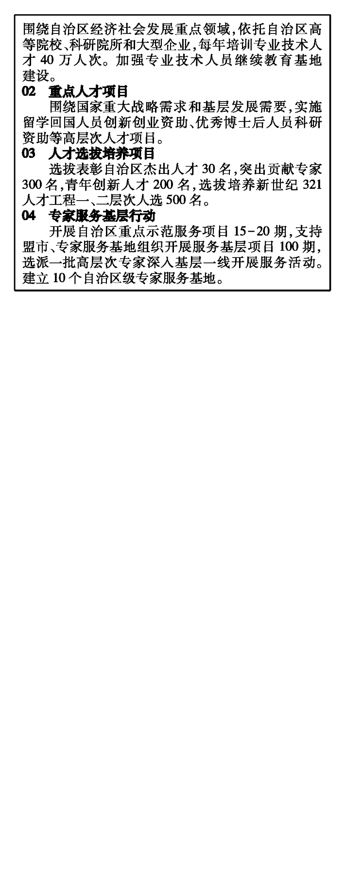 深化人才發(fā)展體制機(jī)制改革,全方位培養(yǎng)、引進(jìn)、用好人才,高質(zhì)量實(shí)施人才選拔培養(yǎng)計(jì)劃,造就更多科技領(lǐng)軍人才和創(chuàng)新團(tuán)隊(duì),培養(yǎng)一批青年科技人才后備軍。堅(jiān)持高端引領(lǐng),強(qiáng)化榮譽(yù)激勵(lì),深入實(shí)施人才選拔培養(yǎng)計(jì)劃,選拔推薦全國(guó)杰出專業(yè)技術(shù)人才、政府特殊津貼專家,組織評(píng)選自治區(qū)杰出人才、突出貢獻(xiàn)專家、青年創(chuàng)新人才,選拔培養(yǎng)新世紀(jì)321人才工程人選,形成梯次銜接的人才培養(yǎng)選拔制度體系。加強(qiáng)高層次急需緊缺和骨干專業(yè)技術(shù)人才培養(yǎng),實(shí)施專業(yè)技術(shù)人才知識(shí)更新工程,構(gòu)建分層分類的專業(yè)技術(shù)人員繼續(xù)教育體系。完善博士后制度,實(shí)施優(yōu)秀博士后人員科研資助計(jì)劃,加強(qiáng)博士后科研流動(dòng)站、工作站建設(shè)和博士后人員培養(yǎng),更好發(fā)揮博士后人才在高校院所、科研團(tuán)隊(duì)建設(shè)和企業(yè)技術(shù)創(chuàng)新中的作用。加強(qiáng)留學(xué)回國(guó)人員服務(wù)工作,積極吸引海外留學(xué)回國(guó)人員創(chuàng)新創(chuàng)業(yè)。深入開展專家服務(wù)基層行動(dòng),加強(qiáng)專家服務(wù)基地建設(shè),發(fā)揮高層次專家示范帶動(dòng)作用。進(jìn)一步深化職稱制度改革,修訂完善各系列職稱評(píng)審條件,實(shí)施向非公有制領(lǐng)域?qū)I(yè)技術(shù)人員職稱評(píng)審傾斜政策,加強(qiáng)職稱評(píng)審信息化建設(shè)。規(guī)范職業(yè)資格管理工作。