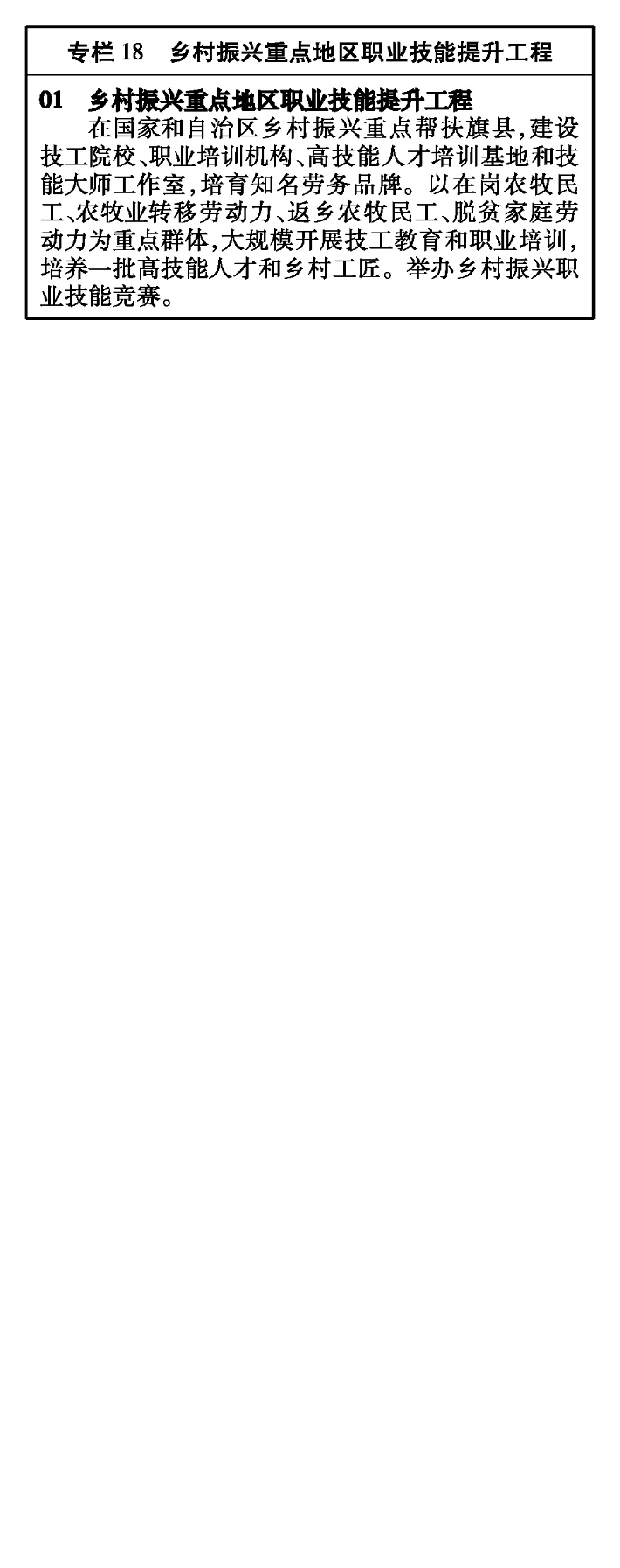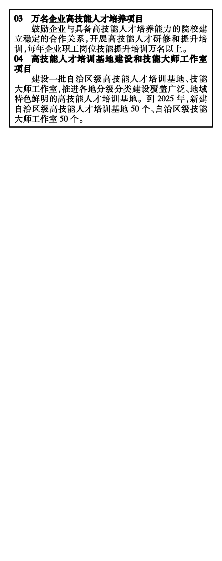 加強(qiáng)創(chuàng)新型、應(yīng)用型、技能型人才培養(yǎng),實(shí)施技能提升行動(dòng),弘揚(yáng)工匠精神,培養(yǎng)更多技能人才、能工巧匠和大國(guó)工匠。深入實(shí)施“百千萬”高技能人才培養(yǎng)計(jì)劃,組織開展百名以上高技能領(lǐng)軍人才、千名以上緊缺急需職業(yè)(工種)技師高級(jí)技師和萬名以上企業(yè)高技能人才培養(yǎng)專項(xiàng)行動(dòng)。加快國(guó)家級(jí)、自治區(qū)級(jí)高技能人才培訓(xùn)基地、技能大師工作室建設(shè),發(fā)揮職業(yè)院校、技工院校培養(yǎng)技能人才主陣地作用。健全技能人才多元評(píng)價(jià)體系,貫通高技能人才與專業(yè)技術(shù)人才職業(yè)發(fā)展通道,在更多領(lǐng)域?qū)崿F(xiàn)互評(píng)互通。完善職業(yè)技能競(jìng)賽體系,推進(jìn)競(jìng)賽基地建設(shè),廣泛開展技能競(jìng)賽。加強(qiáng)高技能人才表彰激勵(lì),營(yíng)造技能人才脫穎而出的良好環(huán)境。完善高技能人才實(shí)時(shí)信息管理平臺(tái),加強(qiáng)高技能人才調(diào)查統(tǒng)計(jì)和需求預(yù)測(cè),開發(fā)高技能人才信息庫和技能成果信息庫。