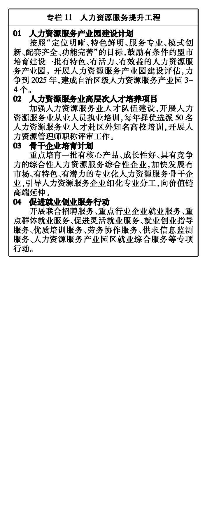 實(shí)施人力資源服務(wù)業(yè)高質(zhì)量發(fā)展行動(dòng),加快建設(shè)統(tǒng)一規(guī)范、競(jìng)爭(zhēng)有序的人力資源市場(chǎng),促進(jìn)就業(yè)創(chuàng)業(yè),服務(wù)人才引進(jìn),助力鄉(xiāng)村振興。加快自治區(qū)級(jí)人力資源服務(wù)產(chǎn)業(yè)園建設(shè),加大政策支持力度,完善服務(wù)體系,提高服務(wù)質(zhì)量。加強(qiáng)人力資源服務(wù)標(biāo)準(zhǔn)化、信息化、品牌化建設(shè),推動(dòng)人力資源服務(wù)與實(shí)體經(jīng)濟(jì)、科技創(chuàng)新、現(xiàn)代金融協(xié)同發(fā)展,與互聯(lián)網(wǎng)深度融合。加強(qiáng)人力資源服務(wù)業(yè)人才培養(yǎng),提高從業(yè)人員專業(yè)化、職業(yè)化水平。完善人力資源市場(chǎng)監(jiān)管體系,嚴(yán)厲打擊就業(yè)歧視、非法職介等侵害勞動(dòng)者權(quán)益的違法行為。培育和規(guī)范行業(yè)協(xié)會(huì)發(fā)展,引導(dǎo)人力資源服務(wù)行業(yè)公平競(jìng)爭(zhēng)、誠(chéng)信服務(wù)、健康發(fā)展。組織開展誠(chéng)信服務(wù)主題創(chuàng)建活動(dòng),選樹一批自治區(qū)級(jí)人力資源誠(chéng)信服務(wù)示范典型。