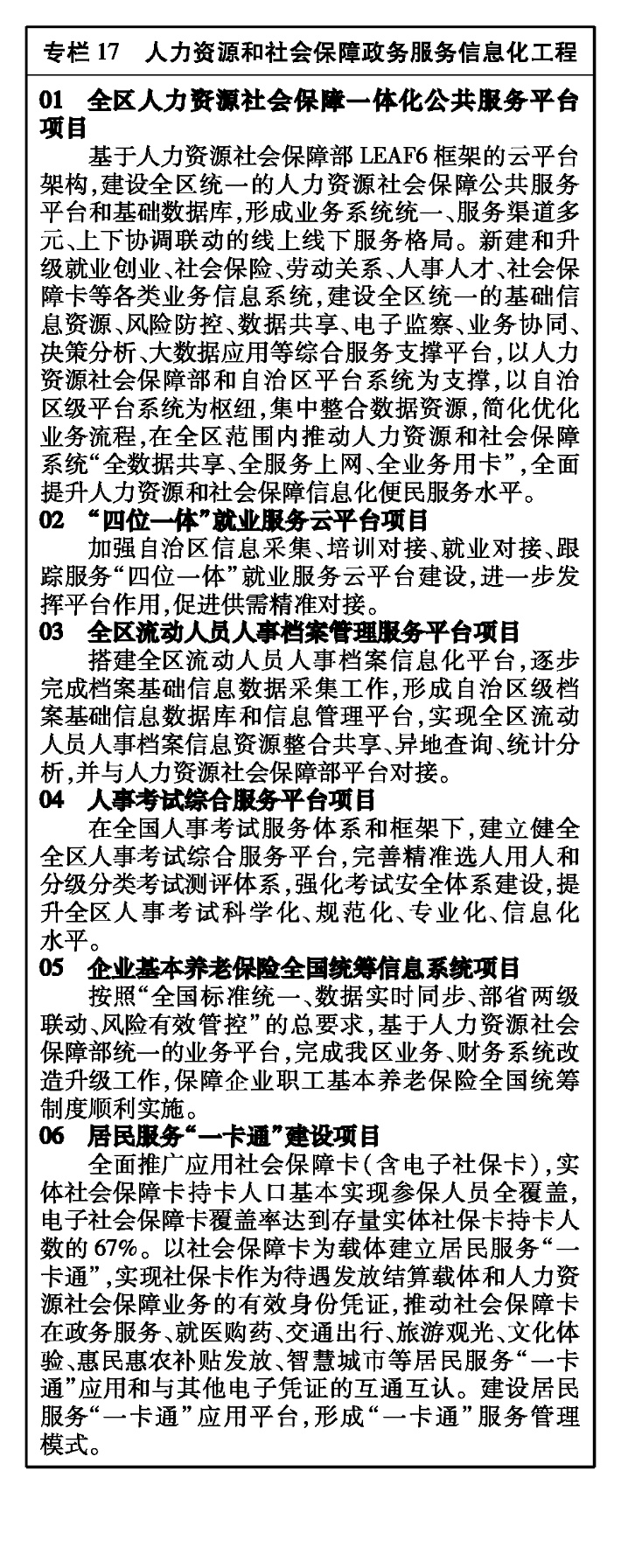 實(shí)施人力資源和社會(huì)保障信息化便民服務(wù)創(chuàng)新提升行動(dòng),促進(jìn)互聯(lián)網(wǎng)、大數(shù)據(jù)、區(qū)塊鏈、人工智能與人力資源和社會(huì)保障工作深度融合,推動(dòng)“全數(shù)據(jù)共享、全服務(wù)上網(wǎng)、全業(yè)務(wù)用卡”。強(qiáng)化基礎(chǔ)信息庫建設(shè),推進(jìn)自治區(qū)級(jí)核心業(yè)務(wù)系統(tǒng)一體化整合。建設(shè)全區(qū)人力資源和社會(huì)保障一體化公共服務(wù)平臺(tái),對(duì)接全國(guó)人力資源社會(huì)保障政務(wù)服務(wù)平臺(tái)。推動(dòng)建立以社會(huì)保障卡為載體的居民服務(wù)“一卡通”。建設(shè)全區(qū)“四位一體”公共就業(yè)服務(wù)云平臺(tái)、與統(tǒng)籌層次相適應(yīng)的社會(huì)保險(xiǎn)服務(wù)平臺(tái)、全區(qū)流動(dòng)人員人事檔案管理服務(wù)平臺(tái),完善人事考試綜合服務(wù)體系建設(shè)。全面深化大數(shù)據(jù)應(yīng)用,依托人力資源社會(huì)保障部和自治區(qū)數(shù)據(jù)共享交換平臺(tái),促進(jìn)與相關(guān)部門數(shù)據(jù)資源共享共用和電子憑證互通互用,加強(qiáng)數(shù)據(jù)資源安全保障和隱私保護(hù)。加快推動(dòng)12333智能化、多渠道建設(shè)。啟動(dòng)人力資源社會(huì)保障政務(wù)服務(wù)信息化工程(金保工程三期)建設(shè)。