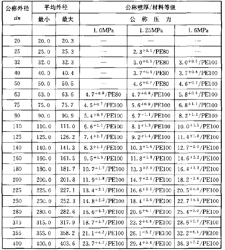 表A.0.1 聚乙烯(PE)管外徑殛公稱壁厚(mm)