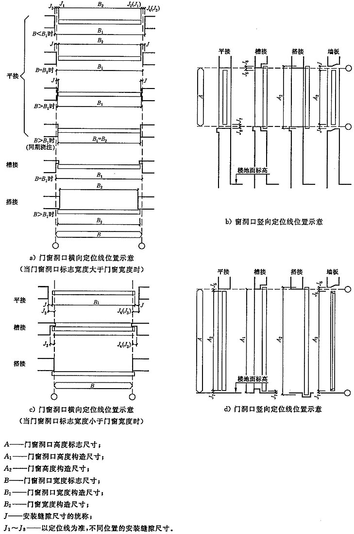 門窗寬、高構(gòu)造尺寸和門窗洞口寬、高構(gòu)造尺寸分別與洞口寬、高定位線之間裝配空間尺寸的總稱,符號(hào)為J。為區(qū)分門窗洞口定位線與門窗構(gòu)造尺寸和洞口構(gòu)造尺寸之間的不同情況的縫隙尺寸,分別以縫隙分尺寸符號(hào)了J1、J2、……、J8表示(見圖1、圖2)。
