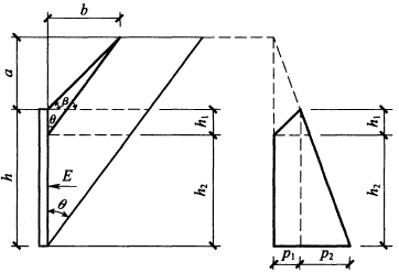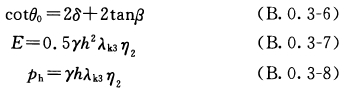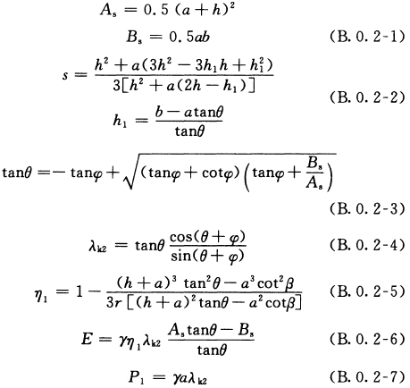 B.0.3 當(dāng)倉壁頂面以上貯料為錐體、破裂面不通過倉中線時(shí)(圖B.0.3),貯料作用于倉壁上的側(cè)壓力按下列公式計(jì)算: