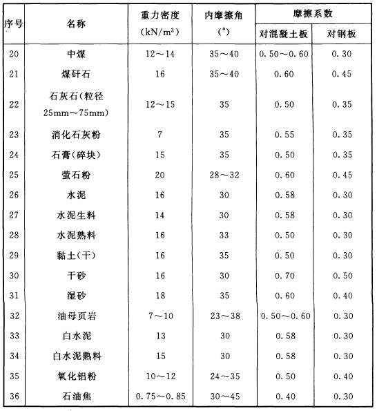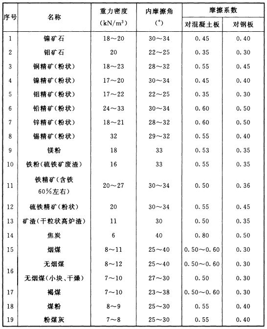 注:1 表中內(nèi)摩擦角和摩擦系數(shù)指散料外在含水量小于12%的值;當(dāng)超過時(shí),需另行考慮;