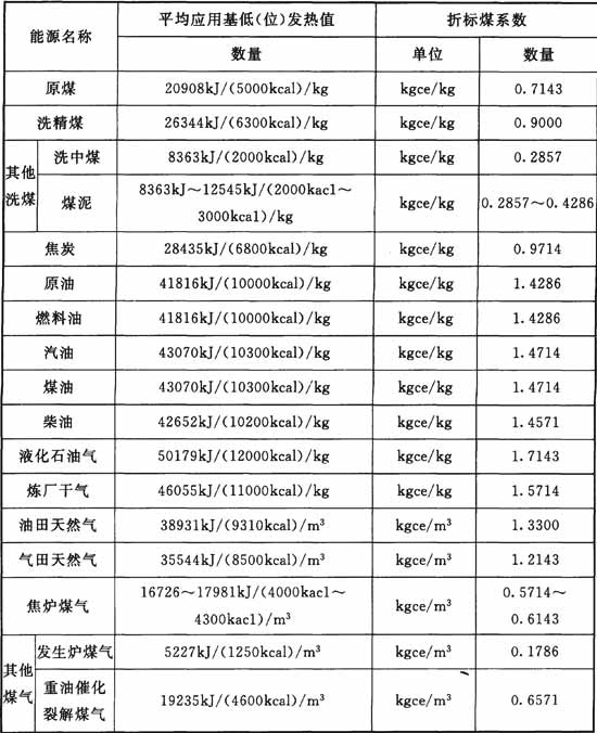 1 外購的各種燃料的發(fā)熱量應(yīng)實測,并按應(yīng)用基低位發(fā)熱量為計算基礎(chǔ)折算成標準煤,其折標系數(shù)為: