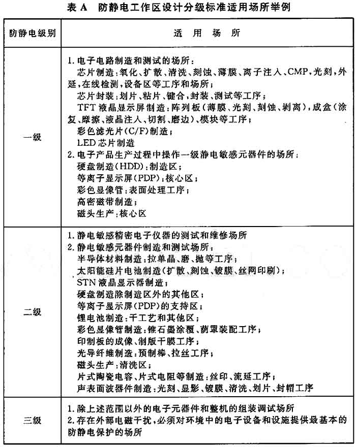 附錄A 防靜電工作區(qū)設(shè)計分級標準適用場所