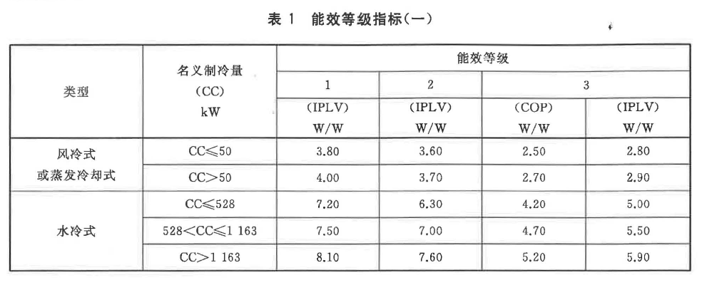 冷水機組的性能系數(COP) ,綜合部分負荷性能系數(IPLV)的測試值和標注值應不小于表1或表2中能效等級所對應的指標規(guī)定值。