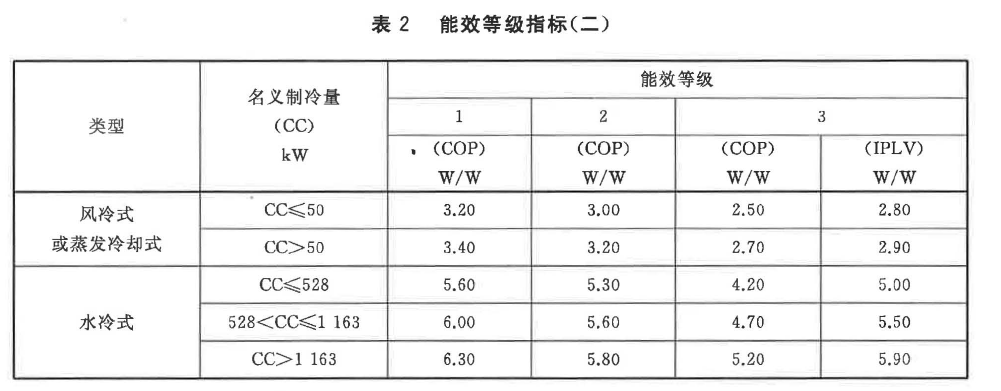 冷水機組的節(jié)能評價值為表1或表2中所對應的能效等級2級所對應的指標值。