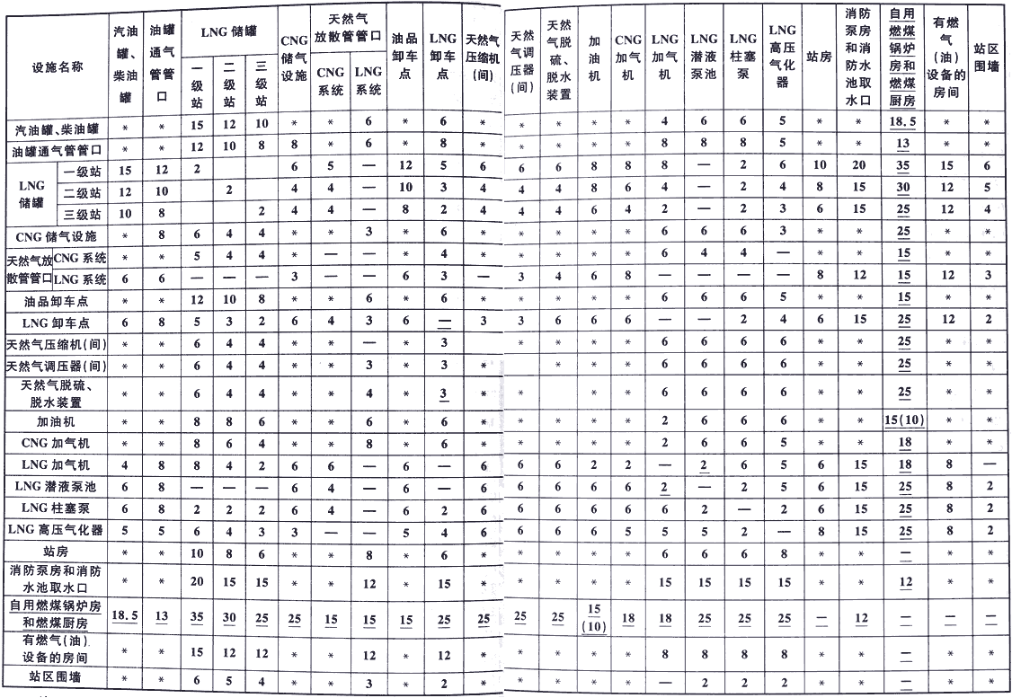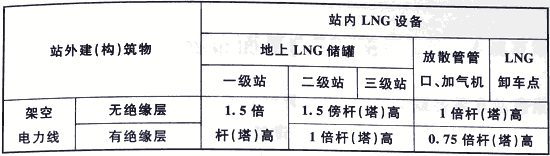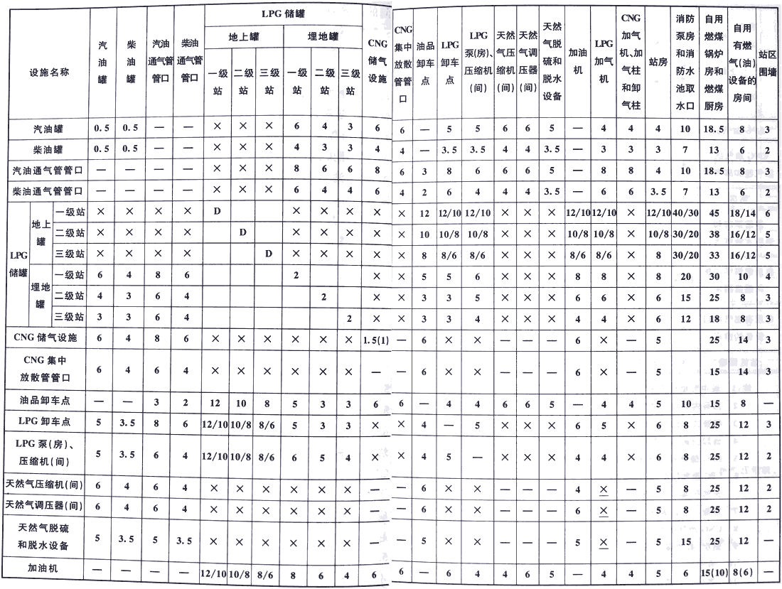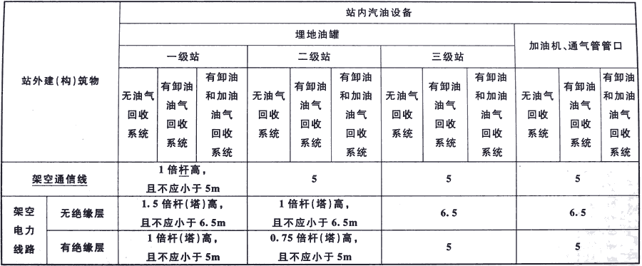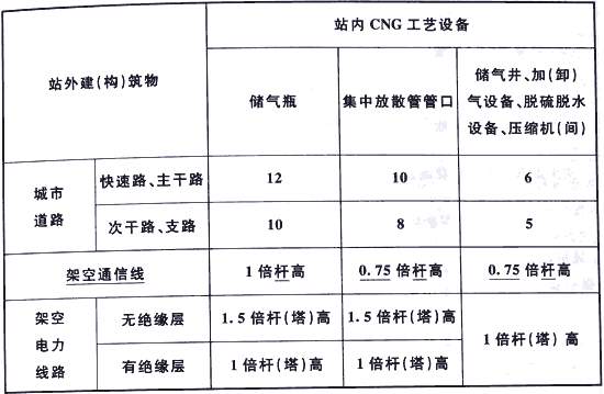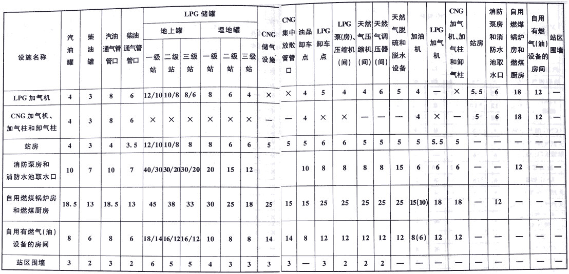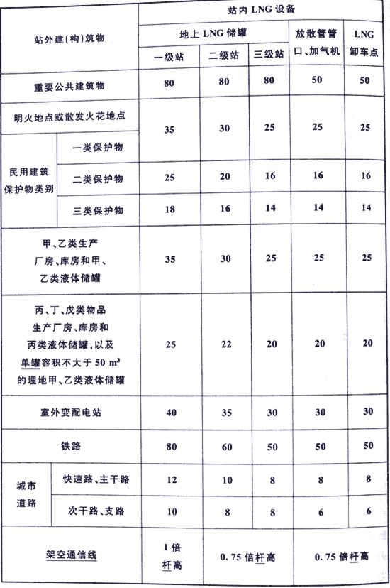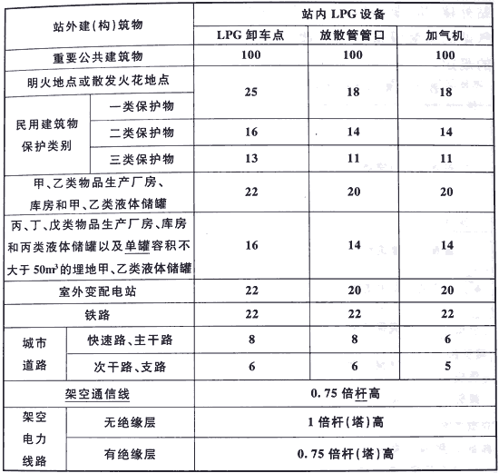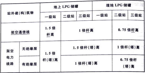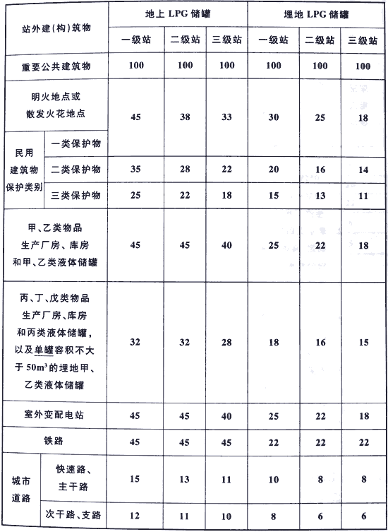 5 容量小于或等于10m3的地上LPG儲罐整體裝配式的加氣站。其罐與站外建(構)筑物的距離,不應低于本表三級站的地上罐安全間距的80%。