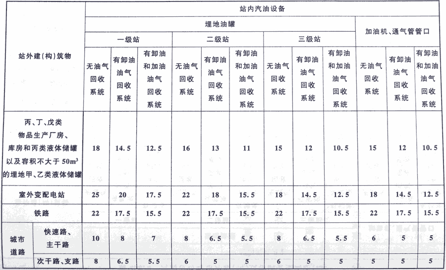 2 表中道路系指機動車道路。油罐、加油機和油罐通氣管管口與郊區(qū)公路的安全間距應按城市道路確定,高速公路、一級和二級公路應按城市快速路、主干路確定;三級和四級公路應按城市次干路、支路確定。