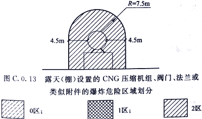 C.0.13 露天(棚)設置的CNG壓縮機、閥門、法蘭或類似附件的爆炸危險區(qū)域劃分(圖C.0.13),距壓縮機、閥門、法蘭或類似附件殼體 水平方向4.5m以內(nèi)并延至地面的空間,距壓縮機、閥門、法蘭或類似附件殼體頂部7.5m以內(nèi)的空間,應劃分為2區(qū)。