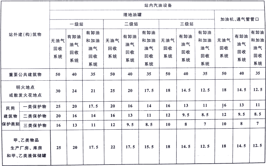 表4.0.4 汽油設備與站外建(構)筑物的安全間距(m)