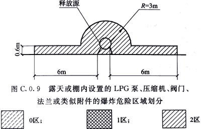 C.0.9 露天或棚內(nèi)設置的LPG泵、壓縮機、閥門、法蘭或類似附件的爆炸危險區(qū)域劃分(圖C.0.9),距釋放源殼體外緣半徑為3m范圍內(nèi)的空間和距釋放源殼體外緣6m范圍內(nèi),自地面算起0.6m高的空間,應劃分為2區(qū)。