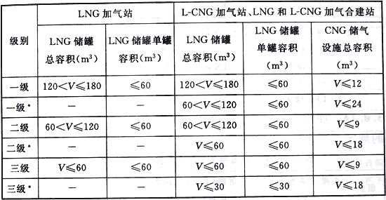 表3.0.12 LNG加氣站、L-CNG加氣站、LNG和L-CNG加氣合建站的等級劃分