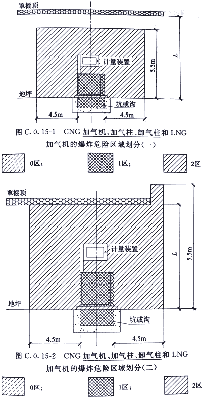 C.0.15 CNG加氣機、加氣柱、卸氣柱和LNG加氣機的爆炸危險區(qū)域的等級和范圍劃分,應符合下列規(guī)定: