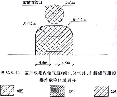 C.0.11 室外或棚內(nèi)CNG儲氣瓶(組)、儲氣井、車載儲氣瓶的爆炸危險區(qū)域劃分(圖C.0.11),以放散管管口為中心,半徑為3m的球形空間和距儲氣瓶(組)殼體(儲氣井)4.5m以內(nèi)并延至地面的空間,應劃分為2區(qū)。