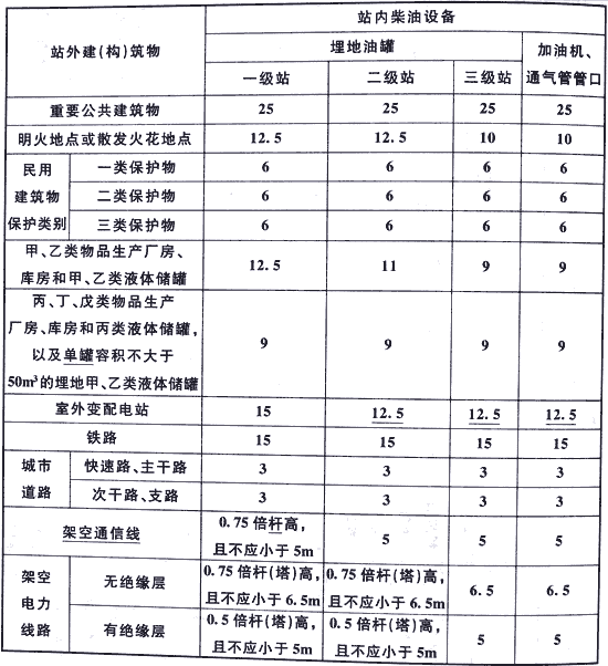 4.0.5 加油站、加油加氣合建站的柴油設備與站外建(構)筑物的安全間距,不應小于表4.0.5的規(guī)定。