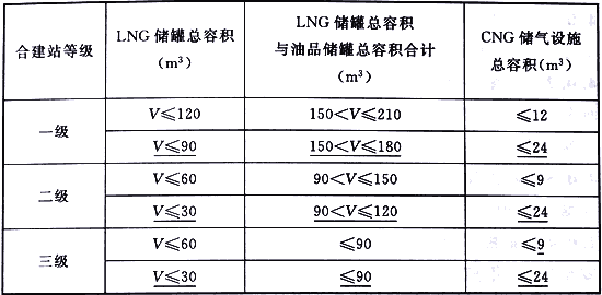 表3.0.15 加油與LNG加氣、L-CNG加氣、LNG/L-CNG加氣以及加油與LNG加氣和CNG加氣合建站的等級劃分