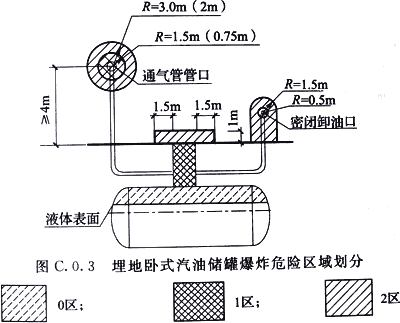 C.0.3 埋地臥式汽油儲罐爆炸危險區(qū)域劃分(圖C.0.3),應符合下列規(guī)定: