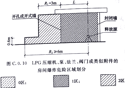 C.0.10 LPG壓縮機、泵、法蘭、閥門或類似附件的房間爆炸危險區(qū)域劃分(圖C.0.10),應符合下列規(guī)定: