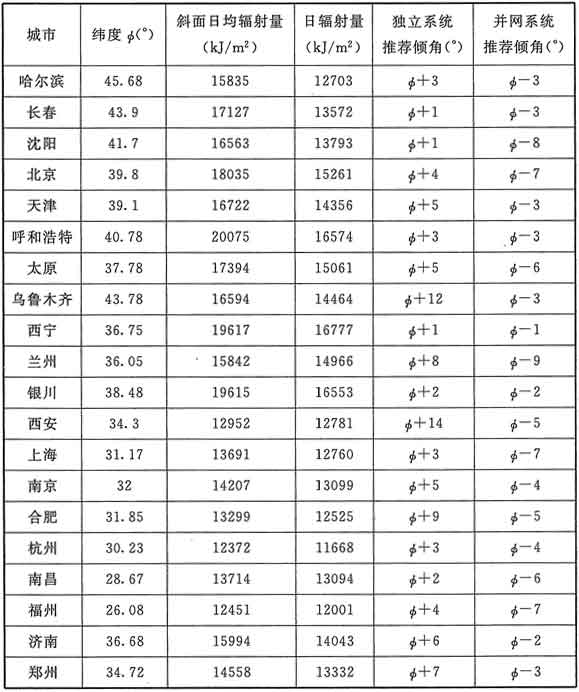 表B 全國各大城市光伏陣列最佳傾角參考值