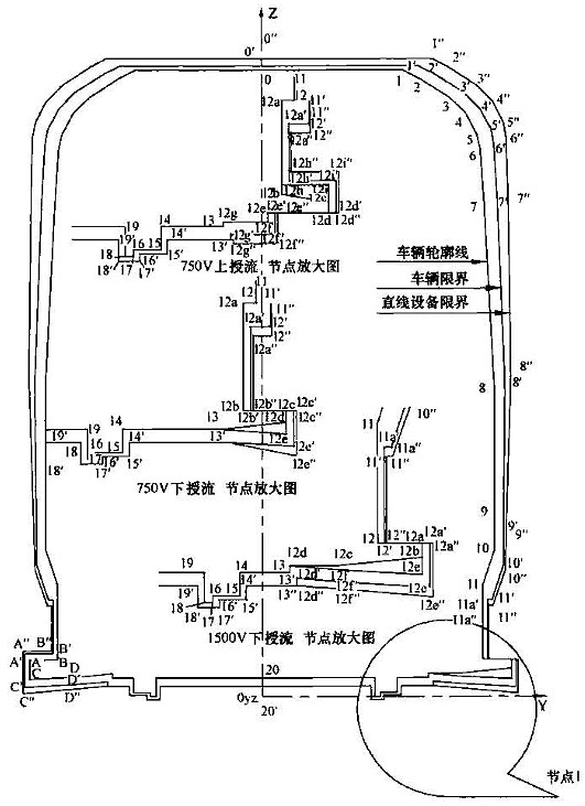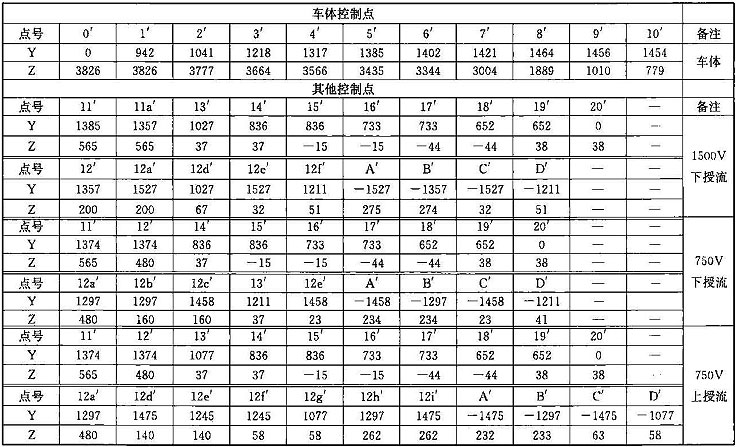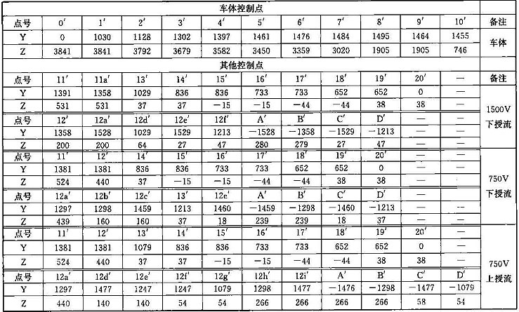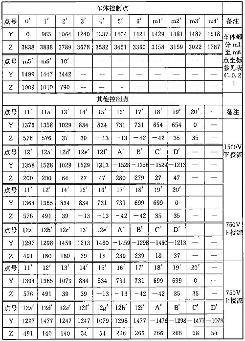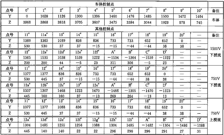 注:1 表中第0~11點(diǎn)是車體上的控制點(diǎn);13~14點(diǎn)是軸箱簧下控制點(diǎn);15~16點(diǎn)是車輛踏面控制點(diǎn);17~18點(diǎn)是輪緣控制點(diǎn);19~20點(diǎn)是齒輪箱控制 點(diǎn);m1~m6點(diǎn)是開門狀態(tài)車門控制點(diǎn);第12~12d點(diǎn)是受電靴工作狀態(tài)控制點(diǎn),12e~12f是受電靴脫靴狀態(tài)控制點(diǎn);A~D受電靴非工作狀態(tài)控制 點(diǎn)。其中11點(diǎn)水平方向?qū)κ芰髌骷败圀w分別計(jì)算,并增加控制一個(gè)點(diǎn),豎向按車底懸掛物計(jì)算;13點(diǎn)水平按照受流器計(jì)算,豎向按照簧下部分計(jì)算。