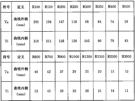 2 豎向偏移量計(jì)算值,按車體肩部處的橫坐標(biāo)值計(jì)算:A型車取1450mm,B型車取1318mm;當(dāng)采用過(guò)超高時(shí),曲線內(nèi)側(cè)求得的豎向偏移量為負(fù)值,曲線外側(cè)求得的豎向偏移量為正值;當(dāng)采用欠超高時(shí),曲線外側(cè)求得的豎向偏移量為負(fù)值,曲線內(nèi)側(cè)求得的豎向偏移量為正值。