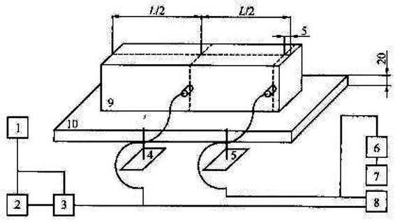 2測(cè)定完試件的質(zhì)量和尺寸后,應(yīng)將試件放置在支撐體中心位置,成型面應(yīng)向上,并應(yīng)將激振換能器的測(cè)桿輕輕地壓在試件長(zhǎng)邊側(cè)面中線的1/2處,接收換能器的測(cè)桿輕輕地壓在試件長(zhǎng)邊側(cè)面中線距端面5mm處。在測(cè)桿接觸試件前,宜在測(cè)桿與試件接觸面涂一薄層黃油或凡士林作為耦合介質(zhì),測(cè)桿壓力的大小應(yīng)以不出現(xiàn)噪聲為準(zhǔn)。采用的動(dòng)彈性模量測(cè)定儀各部件連接和相對(duì)位置應(yīng)符合圖5.0.4的規(guī)定。