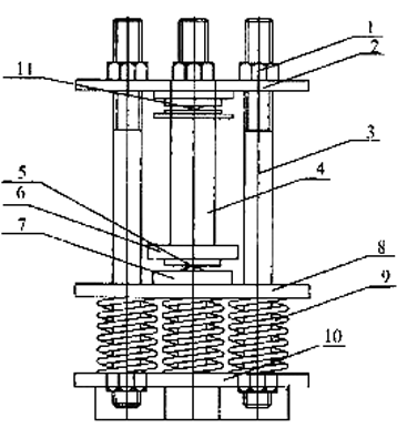 1—螺母;2—上壓板;3—絲桿;4—試件;5—球鉸;6—墊板;7—定心;8—下壓板;9—彈簧;10—底盤;11—球鉸