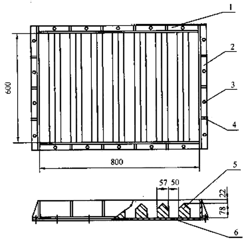 2混凝土早期抗裂試驗(yàn)裝置(圖9.0.2)應(yīng)采用鋼制模具,模具的四邊(包括長(zhǎng)側(cè)板和短側(cè)板)宜采用槽鋼或者角鋼焊接而成,側(cè)板厚度不應(yīng)小于5mm,模具四邊與底板宜通過螺栓固定在一起。模具內(nèi)應(yīng)設(shè)有7根裂縫誘導(dǎo)器,裂縫誘導(dǎo)器可分別用50mm×50mm、40mm×40mm角鋼與5mm×50mm鋼板焊接組成,并應(yīng)平行于模具短邊。底板應(yīng)采用不小于5mm厚的鋼板,并應(yīng)在底板表面鋪設(shè)聚乙烯薄膜或者聚四氟乙烯片做隔離層。模具應(yīng)作為測(cè)試裝置的一個(gè)部分,測(cè)試時(shí)應(yīng)與試件連在一起。