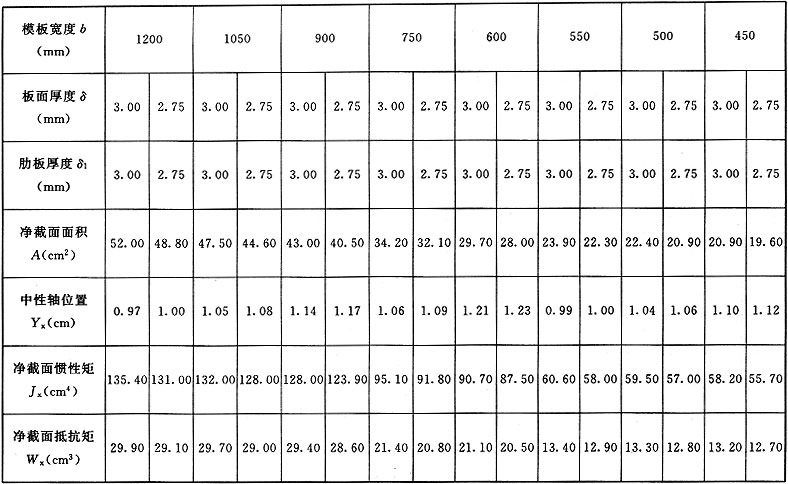 表B 平面模板截面特征