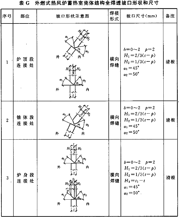 附錄G 外燃式熱風(fēng)爐蓄熱室殼體結(jié)構(gòu)全焊透坡口形狀和尺寸