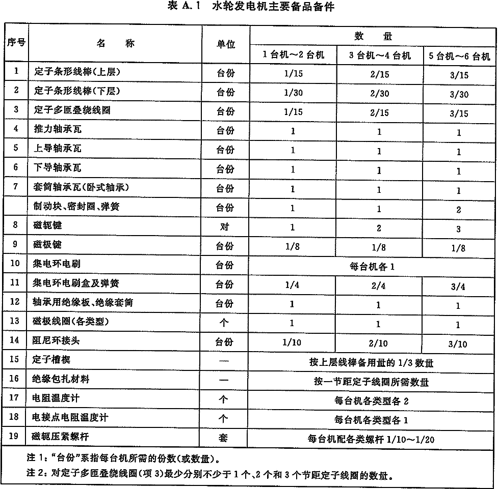 A.2 額定容量為2 000kVA及以上者,制造廠應(yīng)隨水輪發(fā)電機(jī)提供表A. 1開(kāi)列的最小數(shù)量的備品備件。如需變更備品備件的種類和數(shù)量,用戶和制造廠協(xié)商后可在專用技術(shù)協(xié)議或合同中規(guī)定。