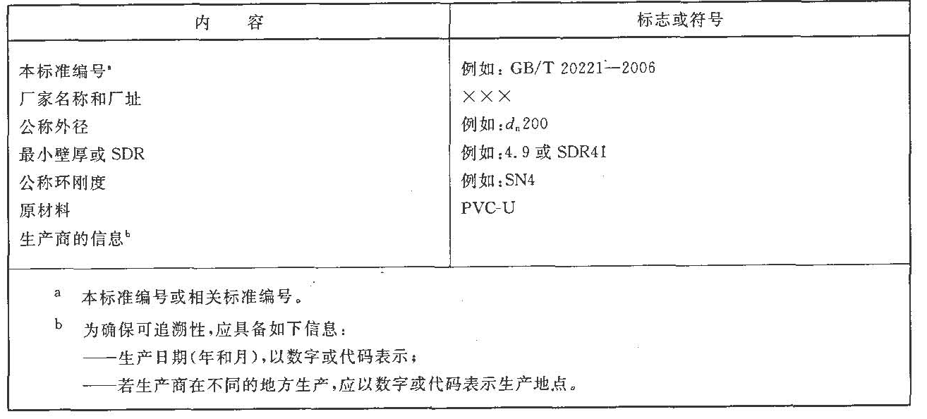 管材應(yīng)最少具有表11規(guī)定的標(biāo)志。每根管材上的標(biāo)志間隔最大為2 m。