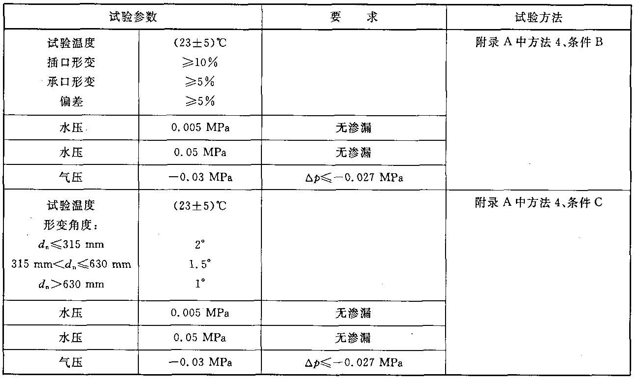 本試驗方法規(guī)定了三種基本試驗方法在所選擇的試驗條件下,評定埋地用熱塑性塑料管道系統(tǒng)中彈性密封圈型接頭的密封性能。