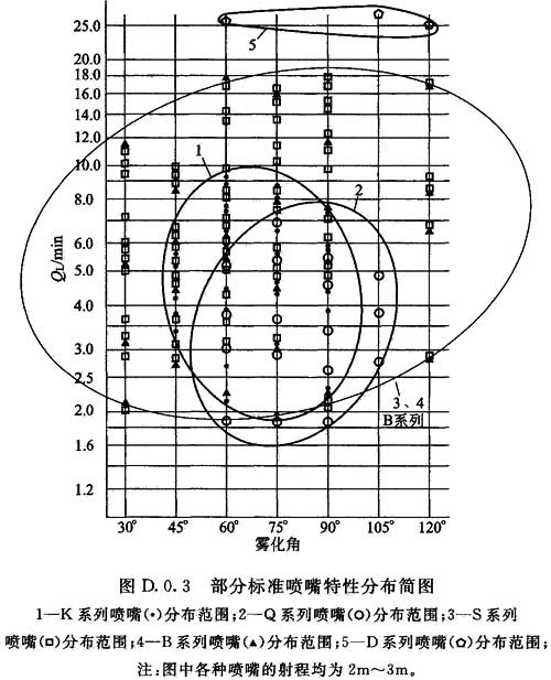 D.0.3 部分標準噴嘴特性分布見圖D.0.3。圖D.0.3中的流量為水壓1.0MPa時的數(shù)值。不同水壓下的流量可按流量與水壓的平方根成正比的規(guī)律推算。